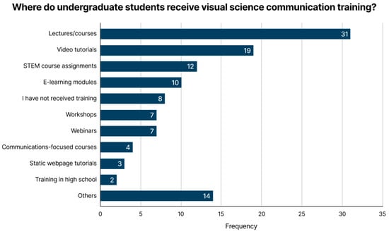 Coursework was the most frequent way undergraduate students experienced visual science communication training, followed by video tutorials (e.g., YouTube (San Bruno, CA, USA)), e-learning modules (e.g., library resources), workshops, webinars, and training completed before starting university (Figure 1). Eight students reported not having received training during their undergraduate education. The majority of students surveyed stated their instructors had not clearly taught them how to create effective visuals (Table 2). Half of all students stated they have received clear feedback on the effectiveness of their creations.