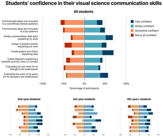 Students’ confidence in their visual science communication skills. First row: All students (n = 53). Second row, left to right: 2nd-year students (n = 21); 3rd-year students (n = 10); students in their 4th year and above (n = 22).
