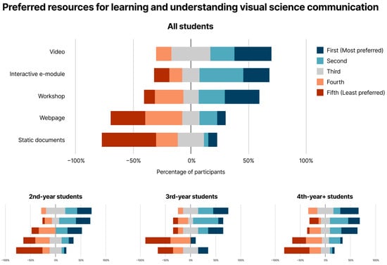 Students’ preferred resources for learning and understanding the topic of visual science communication. First row: All students (n = 53). Second row, left to right: 2nd-year students (n = 21); 3rd-year students (n = 10); students in their 4th year and above (n = 22).