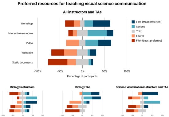 Overall, instructors and TAs ranked interactive e-modules, workshops, and videos as more useful types of resources for teaching visual science communication to their students (Figure 5). Biology instructors favored videos because this type of resource could be integrated into their lectures and provided to students to view on their own time, while TAs favored workshops because interactive activities could be integrated into tutorials to increase student engagement. Conversely, science visualization instructors had a preference for in-person facilitated workshops in which expert guidance could be provided in real time.