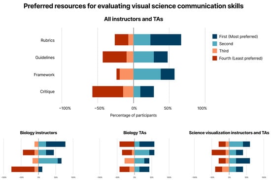 Instructors’ and TAs’ preferred resources for evaluating students’ visual science communication skills. First row: All instructors and TAs (n = 21). Second row, left to right: biology instructors (n = 9); biology TAs (n = 7); science visualization instructors and TAs (n = 5).