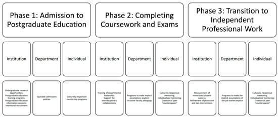 While reviews of the literature indicate that institutional change specific to improving doctoral education for students is sparse, institutions serve as important levers of change for improving postgraduate education representation and success [,]. Thus, institutions must support and train their administration, support interdisciplinary collaboration, create goals, and document progress to increase minoritized doctoral success [,]. Specifically, institutions should focus on creating postgraduate education preparation programs that provide research opportunities and make explicit the hidden curriculum in applying and enrolling in graduate programs. Additionally, institutions should make concerted efforts to recruit and build bridges to minoritized communities and do so in ways that are responsive to minoritized students’ needs. Ultimately, departments and individual personnel operate within the guidelines and expectations established at the institutional level, making this level of support a powerful catalyst for or barrier to equitable change in the field.