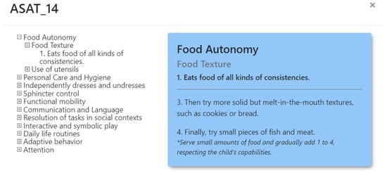 This means that the measurement of functional skills is important for children who suffer from some difficulty in their development. Similarly, monitoring the progression of therapeutic intervention programs allows us to check how effective they are in different groups. Measuring functional skills is based on systematic observation and there are many instruments that currently provide guidelines for such observations, such as the Brunet Lézine Scale [4], the Battelle Developmental Inventory [5], and the Pediatric Evaluation Disability Inventory (PEDI) [6]. There are also programs that facilitate therapeutic intervention, such as the original version of the Portage guide [7]. This guide also includes a record for measuring developmental progress from 0 to 6 years in different developmental areas (motor development, cognition, language, self-help, and socialization). Along similar lines, the web application, eEarlyCare combines observational recording in 11 areas of functional development (food autonomy, personal care and hygiene, independently dresses and undresses, sphincter control, functional mobility, communication and language, resolution of tasks in social contexts, interactive and symbolic play, daily routines, adaptative behavior, and attention) with the creation of a personalized development profile and detection of the most affected functional areas. In addition, eEarlyCare includes a personalized intervention program for each user based on the profile findings. This program guides the teacher or therapist on the most accurate personalized therapeutic intervention [8,9,10].