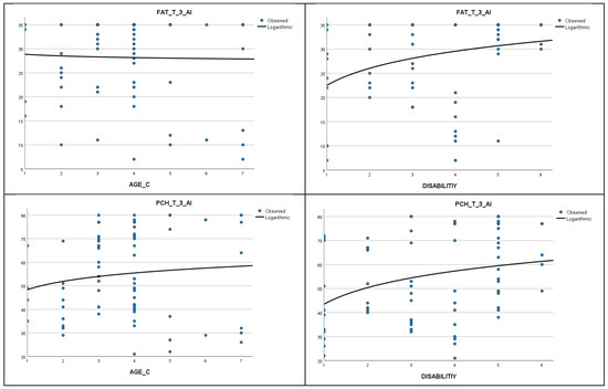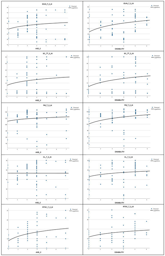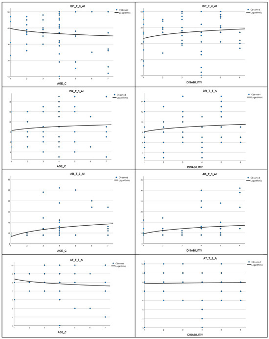 As the regression analysis was significant in the final measurement, a logarithmic regression analysis was performed on the SFA results for the two independent variables “chronological age” and “type of impairment”. In both cases, no significant differences were found (F = 0.05, p = 0.83; F = 0.23, p = 0.63). However, as Figure 4 shows, there are distinct logarithmic trends in FAT_T, CL_T, ISP_T, and AT_T.