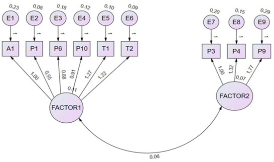 In Table 4 the best coefficients are highlighted in bold and correspond to M1, which has the lowest AIC and a CFI closer to 1, with a smaller RMSEA (<0.1). It reinforces the EFA structure with two factors with small collinearity, which supports the EFA performed assuming varimax rotation. The structure provided by M1 from the CFC is depicted in Figure 1.