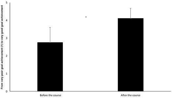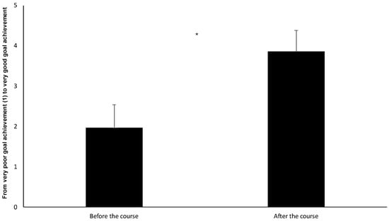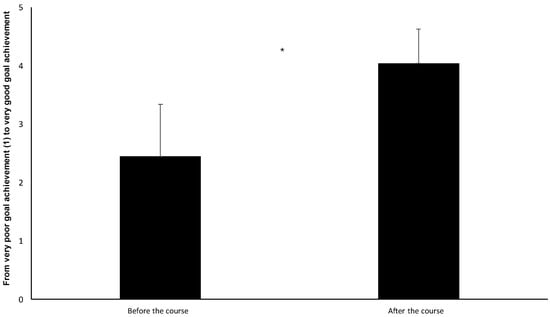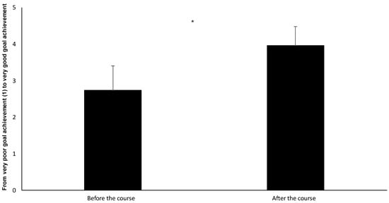 The students’ experience of knowledge of training methods, key concepts, and principles that can lead to skill development in volleyball—how to plan and carry out training in volleyball—before and after the volleyball course. * Indicates a significant increase from before the volleyball course to after the volleyball course (p < 0.001).