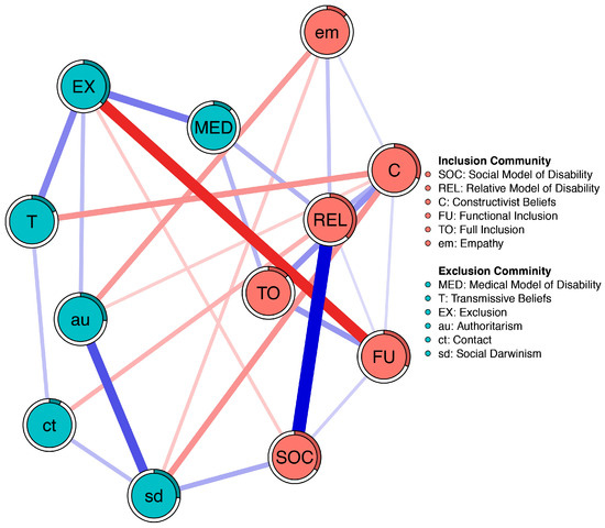 Based on the Framework of Inclusive Education [8], we assumed three communities (Exclusion, Functional Inclusion, and Full Inclusion). The network analysis, on the other hand, revealed two distinct communities: an Inclusion Community and an Exclusion Community. We found consistent reasoning behind the opposition to inclusive education. An Exclusive standpoint, Transmissive Beliefs, and a Medical Model of Disability demonstrate the reciprocal effect assumed by the Framework of Inclusive Education. Considering the MDS plot, these variables appear close, whereas Social Darwinism, Authoritarianism, and Contact are further out.