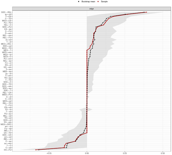 The network is depicted in Figure 2 and demonstrates a good fit (χ2 = 45.00, df = 40, p = 0.270, CFI = 0.985, RMSEA = 0.025, SRMR = 0.044). Concerning the network accuracy, the bootstrap is depicted in Figure 3. As the figure reveals, the network shows sufficient accuracy as the estimates of the edge weights and their bootstrap means were not substantially different (the largest absolute difference between edge weight and its bootstrap estimate is 0.020 for the edge between the Exclusion (EX) and Functional Inclusion (FU) variables).