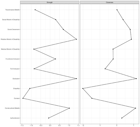 Interestingly, no edge emerged between the Social Model of Disability and Full Inclusion or between the Social Model of Disability and Constructivism. It is possible that the Social Model of Disability is too radical compared to more established, individualized perspectives, which could also account for the low overall agreement with the Social Model. Set on opposite sides of the Inclusion Community, Empathy and the Social Model of Disability share the weakest relation within the community. Empathy itself, although associated with support for inclusive education, shows the weakest values in strength and closeness within the Community. Negative relations with Authoritarianism and Social Darwinism support Hypothesis 2 [33].
