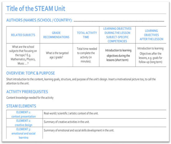 The STEAM-Connect project started in November 2021, with researchers collaboratively crafting a common template (Figure 2) for teachers involved in designing STEAM activities, ensuring a shared structure for organizing their creations. From the project’s onset, a consensus was reached that the scope of the letter A in the STEAM acronym should extend beyond art in the traditional sense to encompass music and the humanities at large, including philosophy.