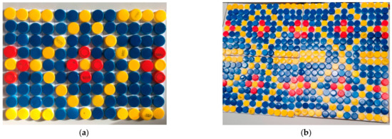 The first part of the activity, occurring within a two-hour art lesson, was dedicated to crafting a modular composition using plastic bottle caps of various colors. The art teacher divided the students into four groups and provided each of these groups with the necessary resources to carry out the activity: a specific number of yellow, white, and blue plastic bottle caps; a cardboard sheet; a gridded sheet where the length of each square corresponds to the diameter of the bottle caps; and glue. A brief explanatory video and the image that the different groups were supposed to reproduce on the cardboard were projected onto the interactive multimedia whiteboard (IWB). The colors of the module were chosen to recall the colors of the Ishtar Gate, which the students had recently learned about in art history. When all the groups had finished the module (an example is shown in Figure 3a), the teacher asked the students to arrange them in different patterns to create different modular compositions, aiming to grasp their differences (an example is shown in Figure 3b). The goal of this initial activity was to envision the repetition of the module as a “shift” and, thus, a translation. Furthermore, the properties of the geometric figure depicted allowed students to reflect on the concept of symmetry.