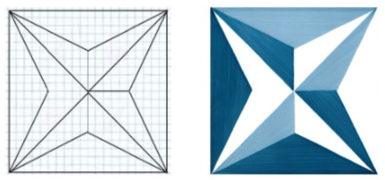The third part of the activity took place during a two-hour technology lesson and focused on the creation of tiles and compositions with geometric patterns. As an introduction, the teacher presented one of the most significant figures in post-World War I architecture: the renowned designer and architect Giovanni Ponti. The teacher drew the students’ attention to the project of the Hotel Parco dei Principi in Sorrento from 1962, in which 27 tiles with different geometric combinations were used. The design featured a bicolor scheme of white and ultramarine blue, with an explicit reference to the colors of water. In Figure 7, one of these tiles is shown, with its geometric structure reproduced. In Figure 8, three possible compositions, each made with four of these, are presented.