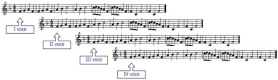 Subsequently, the students were divided into two groups with the aim of singing the canon in two voices. The first group represented the first voice, and the second group represented the second voice. Students in the second group were instructed to imitate the singing of the first group after a two-beat delay, creating a “shift” or translation of the melody.