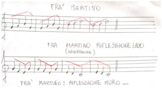 Afterward, the teacher continued by projecting an image of a natural landscape on the IWB. Students were once again asked to identify symmetries and, if present, to indicate the corresponding axis that divides the figure into two equal parts. After sharing some observations and considerations about the concepts of reflection and distance, the teacher reintroduced the song “Fra Martino”, asking the students to try imagining the “reflected” melodic line. The teacher highlighted, in red lines, the “trajectory” of the notes in the “Fra Martino” melody. This way, students could more easily identify the direction of the reflected melody, i.e., an ascending line in the upper staff corresponded to a descending line in the lower staff, and vice versa. The figure below represents the reflected “Fra’ Martino” song (Figure 11).