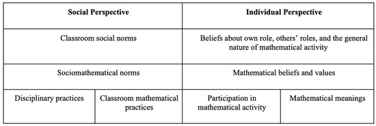An expanded interpretative framework for the emergent perspective is shown in Figure 1, with four constructs for coordinating individual and collective progress shown in the bottom row [2]. Social and sociomathematical norms, which appear in the first and second rows under the social perspective of the expanded interpretative framework, are foundational constructs for delineating the classroom microculture and are taken to be reflexively related to an individual’s beliefs [12]. Because our analysis focuses on a 10 min episode in one small group on the second day of class (and not on longitudinal classroom data that would admit analyses of social and sociomathematical norms), we focus our analysis within the bottom row of our expanded interpretive framework.