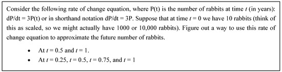 Data for this paper are the video and transcript of Liz, Deb, Jeff, and Joe working together, uninterrupted by the teacher or other students, through a task in their small group on the second day of class. On the first day of class and followed up on the second day of class, students, both in small groups and in whole class discussion, created what they saw as reasonable population versus time graphs for a situation in which the population had unlimited resources and reproduced continuously. Graphs depicting constant rate of change were offered by the instructor as a possibility, but rejected by the students because as the population increased, so would the rate of change. Instead, students argued for exponential growth. The instructor then used their graphs as an opportunity to introduce the rate of change equation dP/dt = 3P as a differential equation that was consistent with their graphs and reasoning that the rate of change would increase as the population increased. Students then worked on the task shown in Figure 3 for approximately 10 min in their small groups. Recall that this was only the second day of class and students had not been introduced to any analytical, numerical, or graphical techniques for analyzing differential equations.
