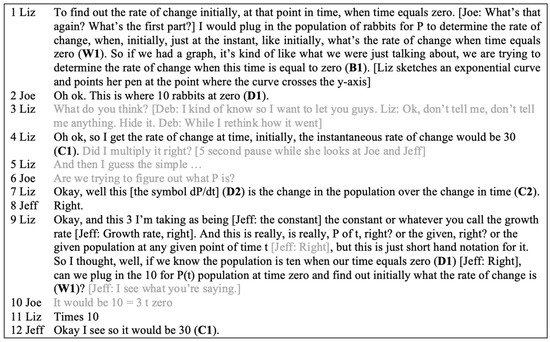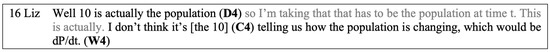In attending to individual mathematical meanings within lines 1–12, we see two different meanings articulated for dP/dt. In particular, in the Claim for Argument 1, Liz plugs in the initial population value of 10 into the rate of change equation and obtains 30, which she interprets to be the instantaneous rate of change. She says “the instantaneous rate of change is 30” while sketching an exponential graph and pointing her pen to where the graph intersects the vertical axis. In calculus, the notion of instantaneous rate of change is often associated with the slope of the tangent line at a point, and this might be how Liz interprets the 30; however, we do not have strong evidence for this graphical interpretation of instantaneous rate of change. A second meaning that emerges for dP/dt is the change in the population over the change in time, which we coded as a ratio of two changes. This discrete, ratio-based interpretation is authored by Liz (line 7) and is the Claim for Argument 2, which she provided in response to a question from Joe, “Are we trying to figure out what P is?”