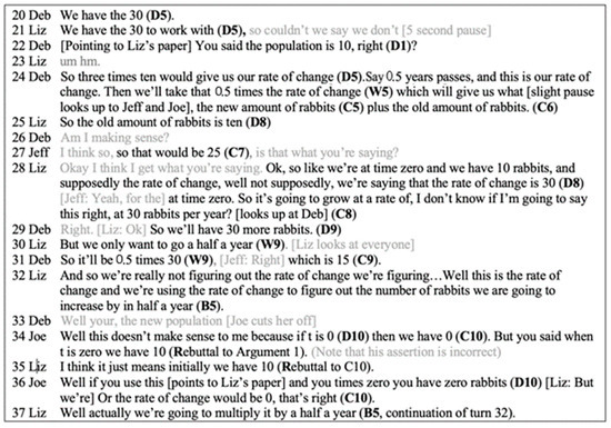 In attending to individual student participation within Argument 1, we see three of the students take on different production roles. Liz is the author for three components of the argument (Claim, Warrant, and Backing) because she is the first one to articulate the respective ideas (lines 1, 4, and 9). Jeff (12) plays the role of relayer for the Claim (which is that the initial rate of change is 30). Recall that a relayer is someone who restates a previously articulated idea. This is significant in this case because it provides evidence that Jeff shares and agrees with the Claim that Liz made. Jeff gives similar confirmation on what we coded as Liz’s Warrant (see (9 Liz) in Figure 3). Joe, for his part, is also an author because he is the first to articulate the Data (line 2), although in what we coded as Argument 3 his interpretation of what the 10 means is incorrect and inconsistent with his groupmates’ interpretation. Deb, who has seen this task before, intentionally pulls herself out of the discussion and hence allows space for her groupmates to develop their own ideas while she privately works the problem. Deb rejoins the discussion, however, in the next segment.
