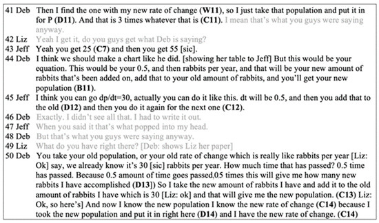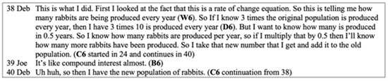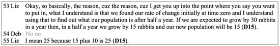 Deb (line 46) agrees with Jeff’s Claim, saying, “Exactly. I didn’t see all that. I had to write it out”. Liz (line 49) then serves as an elicitor to further the clarification of the argument, “What do you have right there? [indicating Deb’s paper]”. Deb (line 50) then serves as a relayer, restating the previous calculations but with an emphasis on enacting them after “0.5 time has passed”. Deb’s explanations in line 50 further serve the algorithmatizing practices of forming quantities and creating and verbalizing relationships between quantities. The quantities formed and the relationships created leverage Deb’s meanings for rate of change. For example, she states in line 50, “You take… your old rate of change which is really like rabbits per year” (a unit ratio meaning) and then “0.5 times this will give me how many new rabbits I have accomplished” (a unit ratio that can be decremented meaning). Deb continues, “I took the new population and put it in right here, and I have the new rate of change” (a quantity that can take on different values meaning).