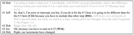 This transition of the earlier Claims from Arguments 5 and 6 to interpretations that function-as-if-shared sets the stage for the generalization of these relationships needed to create the iteration of the algorithm. Following from Deb’s statement in (line 44), Jeff (line 45) is the author of a new Claim (Argument 12) and a relayer of the ideas contained in the Data for this Claim. The Claim of Argument 11 starts the iterative process by pointing to the new rate of change at 0.5. The Claim for Argument 12 states that the entire cycle of calculations should be repeated with the Data for Argument 12 highlighting the previous calculation of multiplying dP/dt by 0.5 (Claim of Argument 5) and then adding the result to the old P (Claim of Argument 6).