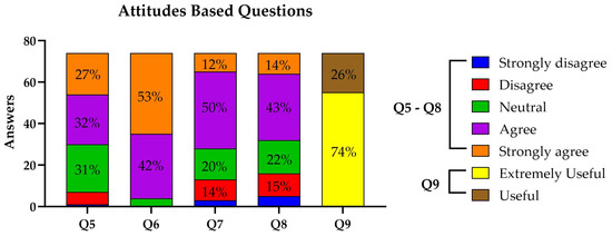 Concerning participants’ Attitudes type of questions, the results can be seen in Figure 2 (Q5–Q9). Question 5 explored the consideration of ethical issues, where a significant 59% of participants strongly agreed or agreed that there may be severe ethical concerns; on the other hand, 8% disagreed, and 1% strongly disagreed, representing the minority with less concern regarding the ethical implications; while a substantial portion, 31%, remained neutral, indicating a potential ambivalence or a need for further exploration of the topic (Figure 2—Q5). In Question 6, a substantial 53% of respondents strongly agreed with the utility of these AI skills, while 42% agreed, signifying a collective consensus on the practicality of these competencies in everyday life; and a minimal 5% reported neutrality (Figure 2—Q6). The responses regarding Question 7 were varied; while 62% of participants strongly agreed or agreed that they comprehended these applications, 18% disagreed or strongly disagreed, and 20% remained neutral reflecting a segment with limited understanding or skepticism (Figure 2—Q7). Similarly, in Question 8, the majority, 43%, agreed, with an additional 14% strongly agreeing, indicating that a significant proportion acknowledged the connection between AI and health disparities; and conversely, 22% disagreed or strongly disagreed, meanwhile a notable 22% remained neutral (Figure 2—Q8. Finally, Question 9, which examined the perceived utility of AI in participants’ respective areas of work, obtained a majority, 74%, who regarded AI as extremely useful, while 26% found it helpful (Figure 2—Q9).
