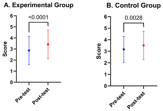 Comparing all questions together pre-test and post-test scores means with ± standard deviation among our participant groups. (A) Comparison for the Experimental Group (data-literate). (B) Comparison for the Control Group (data-literate). A p-value of less than 0.05 was considered statistically significant.