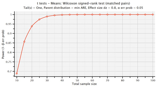 In addition, statistical power for the survey’s total score was evaluated using the Wilcoxon signed-rank test. The methodology involved specifying the effect sizes observed, adhering to a significance level of alpha = 0.05, and documenting the sample sizes for the analytical groups, with the experimental group consisting of 32 participants and the control group comprising 18 participants. Following these steps, the achieved power (1—beta) was computed to determine the study’s ability to detect true effects. This analysis was conducted using Stata 16.1 software and G*Power version 3.1.9.7, selected for its capability to meet the specific demands of the Wilcoxon signed-rank test, ensuring a robust and accurate power analysis tailored to the study’s requirements.