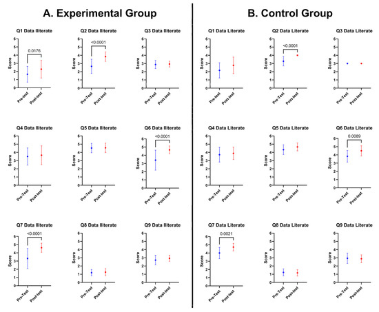 Comparing the pre-test and post-test scores means with ± standard deviation per question among for each group. (A) Comparison for the Experimental Group (data-literate). (B) Comparison for the Control Group (data-literate). A p-value of less than 0.05 was considered statistically significant.