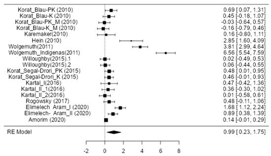 - Age: The analysis of the results was based on the participants’ age. Table 3 shows the summary of this model under three categories: the participants’ age could be 4, 5, or above 5 years old. The average effect was high in the group of those aged 5 years and above. In the category of those aged 4our years, there was no effect. Only the model relative to those aged 5 years was statistically significant (p = 0.00). The I2 indicates the percentage of heterogeneity in these groups. I2 was low for the 4-year-old subgroup but high in the other two subgroups. We considered the 4-year-old subgroup to assess the validation of the effects in the meta-analysis. There were no significant inter-category differences in the groups (Qw) (p = 0.00) but significant differences within a category (Qb) (p = 0.09).
