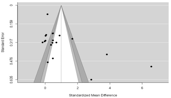 In Table 2, we used a random effects model [29] which showed the heterogeneity among the selected studies. The random effects model was chosen with the I2 estimator hedges, i.e., the variability in the effect due to heterogeneity, where I2 = 97.59% was observed, meaning that there was high heterogeneity among the studies. The assessment of publication bias consisting of Rosenthal’s fail-safe N was high (value = 852.0, p < 0.001) and the p-value of Begg’s and Mazumdar’s rank correlation tests was 0.186, suggesting the absence of publication bias [30]. However, Egger’s test yielded low results that indicated the presence of bias (value = 2.86, p = 0.004). This situation must be considered when assessing and interpreting the assessment of publication bias. In contrast, regarding the existence of publication bias, a graphical method, namely a funnel plot, detected heterogeneity by sensing the data points within a triangular shape (Figure 2) that had symmetrical behaviour. Figure 2 shows the absence of bias; the dotted line allows us to perceive a symmetrical graph, which indicates that all relevant articles have been included in the analysis.