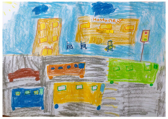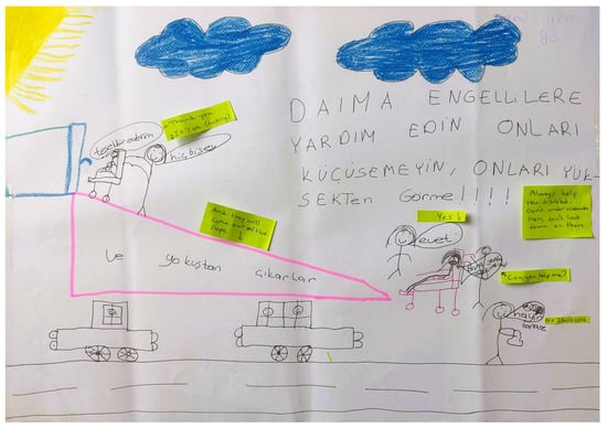 The dominant colors in the drawings related to exclusion, physical challenges and hospital/rehabilitation centers were black, grey, brown and some earth tones. Among these stable colors, black and gray were most widely used in drawings related to exclusion, while brown and earth tones were used to depict the indoor areas. In the themes of help/friendship and success, light and vibrant colors such as yellow, orange, green and pink were used, which symbolize hope and happiness. Peers often depicted individuals with special needs as a student with an orthopedic impairment who has difficulties in every medium and are looking for help; they also expressed in their pictures that the difficulties they experience could be easily overcome with the help of others. Yaşaran, Batu and Özen underlined that inclusion practices are critical in helping peers understand individuals with special needs and realize the difficulties they experience. These authors stated that inclusion practices enable peers to gain knowledge about how to help their special needs friends [40].