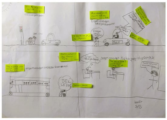 The help and friendship theme is related to the companionships established with individuals with special needs and the assistance provided to them. For example, in the first picture, the child with a visual impairment is upset because he cannot enter the apartment block and says, “I wish there was an elevator or ramp”. The typically developing person shown in the picture is upset about this situation and helps him. On the right side of the picture, a student with an orthopedic impairment (he is in a wheelchair) is trying to cross the street with the help of a guide dog. In the second picture of the theme, a girl with an orthopedic impairment (she is also in a wheelchair) is crying and asking for help on the top of the stairs inside the building, and someone helps her. Similarly, in the seventh picture, someone helps an individual with special needs to climb the stairs. In the third picture, people helping a student with an orthopedic impairment in different places such as hospitals, restaurants, markets, and parking lots are portrayed. In the fourth picture, three different places are described. In the first scene, a student with an orthopedic impairment is trying to cross the street with a parawalker and someone is helping him. In another scene, a person with aphasia is speaking, but the other person complains, “I don’t understand” and takes the special needs person to the police for help. In another scene, the police officer holds a culprit who was threatening a girl with a visual impairment. In the fifth picture, a person in a wheelchair waiting in front of the ramp to enter the building asks for help, and one person says “I don’t care” and refuses to help, whereas the other one says, “of course, I’ll help you,” and carries him off the ramp. There is also a note in the picture that reads: “always help people with disabilities, do not underestimate them, do not look down on them” (Figure 3).