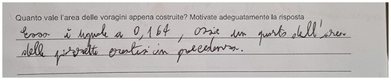 The remaining groups instead used more formal and symbolic language. They were able to express with symbols the areas requested in terms of the area A of the initial triangle. One of those groups stressed that the area requested at each step was equal to of the area requested in the previous step. In other words, they expressed the recursive structure of the construction, and consequently of the areas. An example of this is reported in the protocol in Figure 4, where students, when asked about the value of the area of the sinkholes they had just built, stated that “it is equal to 0.164, that is a quarter of the area of the triangular squares built in the previous step” (translation provided by the authors). The specific value of the area has been calculated by students referring to the specific triangle they had built on GeoGebra.