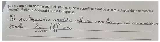 The second issue assumed relevance in the Grade 12 class. During the discussion, the groups had difficulties connecting their intuition to their mathematical knowledge: they reached a symbolic expression to represent the requested area at step n, which was A. Then, some groups asserted that, intuitively, the area was going to tend to 0, to the infinity, but making n tend to the infinity in the symbolic expression, they were concerned that the result might be infinity (“a number elevated to the infinity is equal to infinity”). Another similar example is in the protocol shown in Figure 5, where students write that “the protagonist would have an infinite surface to walk on because ” (translation provided by the authors).