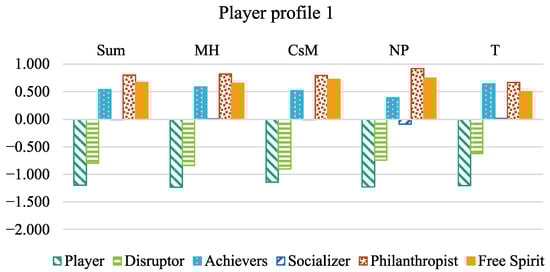 The first cluster comprises a total of 137 participants. The resulting player profile is characterized by the negative expression of the Player and Disruptor types, with the Disruptor being less strongly negative and having a higher variance and standard deviation. Regarding the study directions, it is noticeable that MHs evaluate the Player type most negatively (see Figure 1).