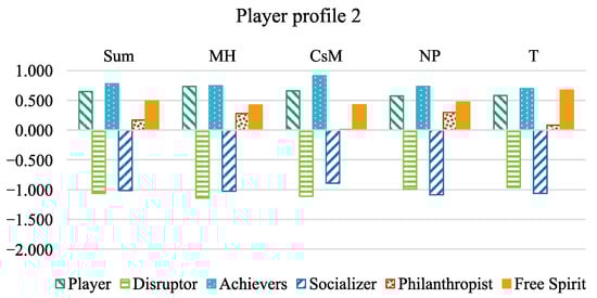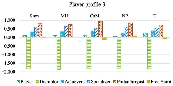 The last cluster comprises 260 participants and is thus significantly larger than the other two. In this player profile, the Disruptor again attains a strong negative expression. The Philanthropist type finds the strongest positive expression. This is most pronounced in CsM followed by NP (see Figure 3). In the case of MH, the Socializer is remarkably positive in this cluster (see Figure 3).