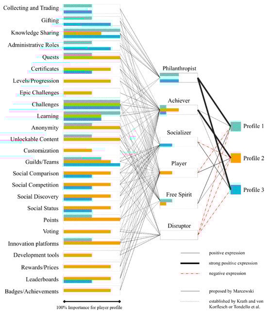 The mechanics known from the literature were analyzed as described in Section 3. This resulted in 21 mechanics that have different relevance for the respective player profiles. These can be seen in Figure 4. The non-relevant mechanics are not listed. The middle column of the figure shows which weights the player types have for the respective profiles. The total length represents the maximum sum of all weights. Solid connections on the right side indicate positive expressions of the player types in the player profiles. The thicker the line, the stronger the expression. Red dashed lines show negative expressions. The left column shows the sum of the weights of the respective mechanics. The sum results from the weights of the player types, if they are relevant for the player type according to the literature. The solid lines on the left indicate the mechanics for player types proposed by Marcewski [21], the dotted lines the associations identified in [20,22].