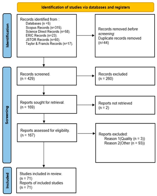 We conducted a comprehensive search of five reputable electronic databases, namely Science Direct, ERIC, JSTOR, Taylor & Francis Online, and Scopus, covering the period between 2013 and 2023. These databases are widely recognized as reliable sources of educational scientific data, which is why we relied on them for our research. Our search was restricted to peer-reviewed articles published in English. Two researchers (M.H. and H.G.) independently searched the databases using a variety of search terms and strategies, including Boolean operators, to ensure that we captured as many relevant studies as possible. Appendix A presents the search terms. It is important to note that different databases have different research strategies and roles; thus, the researchers needed to adapt the research protocol to the database requirements.