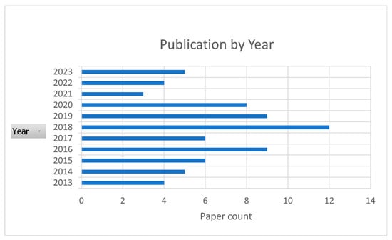 The research papers that were extracted spanned a decade, from 2013 to 2023. The year with the most publications was 2018, with a total of 12 papers. The paper count for each year is presented in Figure 2. It is also noticeable that the years 2018–2020 had the highest number of publications.