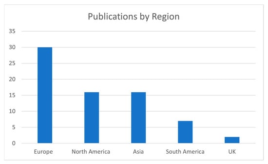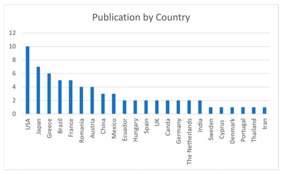 Publications originated from various regions, with Europe leading in terms of the number of publications, at 30, while the United Kingdom had the lowest number of publications, at 2, as presented in the following (Figure 3). However, when considering the country-level analysis, it was found that the United States had the highest number of publications in this field, with 10 publications, followed by Japan, with 7 publications, as presented in Figure 4.