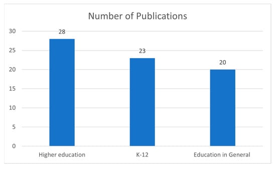 The papers that were analysed covered various educational levels. Figure 5 presents the number of publications for K-12, higher education, and education in general, as some studies did not specify the educational level or had mixed groups.