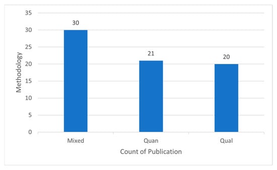 Based on our analysis of the research methods used in the papers we extracted, we found that the majority of them used a mixed-methods approach. In fact, out of all the papers, 30 of them employed this method. The figure below (Figure 6) illustrates the various methodological approaches used in all the papers.
