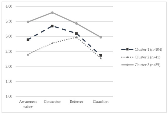 No precise profiles were visible in these clusters, as they did not show a specific mix of low values of certain role perceptions with high values of other role perceptions. Instead, clusters differed in the extent to which the roles match teacher perceptions. This is also pointed out by the moderately high entropy score of 0.74. Cluster 1 covered the most significant proportion of teachers (n = 104). This cluster contained teachers who endorsed the role perceptions of the connector, awareness raiser, and referrer, whereas the guardian role fitted less within their perception. Compared to teachers in other clusters, they endorsed the roles of connector and awareness raiser more than teachers in cluster 2 (n = 41) and less than teachers in cluster 3 (n = 35). Cluster 2 covered teachers who scored highest on the referrer role perception compared to other role perceptions. Cluster 3 displayed a similar pattern to cluster 2 (with connector scoring the highest; next, the awareness raiser and referrer; and, ultimately, the guardian role), but scores were higher across all role perceptions. Table 4 provides mean scores on role perceptions within clusters.