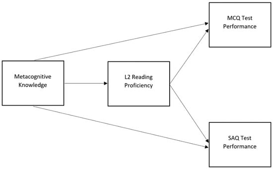 In path analysis, a series of multiple regressions are conducted simultaneously to evaluate hypothesized causal models by estimating interrelations among observed variables. Moreover, path analysis estimates the direct effects of a predictor variable on an outcome variable and also the indirect effects that are generated by an intervening variable influencing the relationship between predictor and outcome variables [55]. To address the research questions, a hypothesized path model (Figure 1) was established to investigate (1) the relationship between metacognitive knowledge and L2 reading test performance, (2) the role that L2 reading proficiency plays in this relationship, and (3) whether metacognitive strategies differentially influence the test performance in different question formats. In this hypothesized path model, metacognitive knowledge (i.e., strategies) serves as the predictor variable, while the outcome variables are MCQ and SAQ test performance. The intervening variable in the model is L2 reading proficiency.