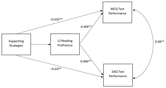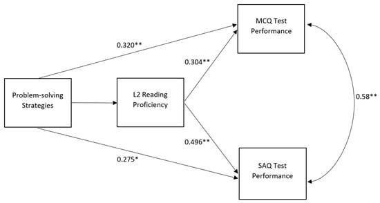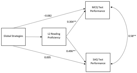 Similar to previous studies, path analysis revealed that students’ L2 reading proficiency was a significant predictor of their L2 reading test performance [35,37,38,48,49]. Undoubtedly, L2 learners’ performance on language tests is heavily dictated by their L2 language proficiency [57]. It is worth noting that L2 reading proficiency had a more positive impact on SAQ test scores than MCQ test scores, primarily due to the larger value of β. Because SAQs do not come with prescribed options, they are usually more challenging than MCQs [58], which is also illustrated in the descriptive statistics of this study. Thus, when working on a challenging reading test, students’ L2 reading proficiency might play a more important role.