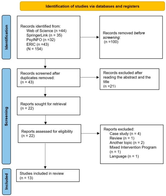 In total, after searching the databases and the keywords used, 154 studies were found. Of these, 22 were screened based on the relevant abstract and title. Of the 22 studies screened for eligibility criteria, 9 were excluded, as 4 were case studies, 1 was a review, 2 were related to another topic, 1 was related to a mixed intervention program (dance and mixed music therapy program), and the last study was not available in English. In the end, 13 studies were selected that met all the eligibility criteria. Of the 13 studies, 4 focused on improvisational music therapy, 2 on group music therapy, 1 on Orff music therapy, 1 on mime music therapy, 2 on family-centered music therapy, 1 on piano music therapy, and 2 on the therapeutic relationship during music therapy intervention.