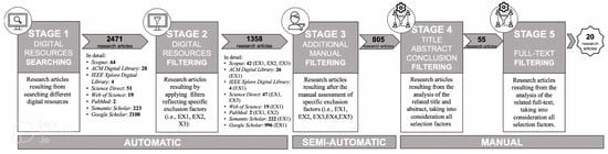- Stage 3: Additional Semi-Automatic Filtering—The research articles obtained as output from stage 2 were collected in a unique electronic sheet by reporting the related authors’ list, title, year of publication, and source (e.g., name of the journal or conference proceedings where it was published). If there was missing information (e.g., sources), it was retrieved manually and inserted in the electronic sheet. Since many digital libraries do not provide automatic filters related to all the listed exclusion factors in Table 3, in this stage, they were applied semi-automatically. For example, many research papers that survived stage 2 were often archived twice or even three times; in stage 3, these duplicates were removed (according to EX4). Furthermore, research articles that were semi-automatically excluded were those not published in peer-reviewed journals or conference proceedings and presenting reviews or similar contributions (according to EX3). This activity was conducted by analysing the titles and sources of the retrieved research articles. Additionally, in this stage, corresponding authors of those research articles not fully available were contacted (according to EX5).