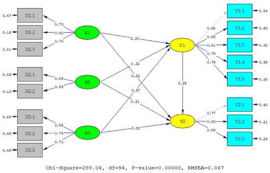 A high degree of suitability indicates a good fit, according to the goodness-of-fit (GOF) test, which assesses the theoretical model’s correlation with empirical data. Nine out of the eleven criteria indicated a good fit, according to the results, while the other two had poor GOF. The criteria that were met were the RMSEA, GFI, NFI, NNFI, AGFI, CFI, RFI, normed chi-square, and PNFI; however, sig. probability and chi-square were not met. Hair et al. [] noted that although there are difficulties with large samples—like the 465 individuals in this study—the GOF test results are still valid (fit) because nine out of the eleven samples satisfied the requirement.