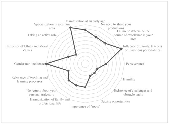 On the other hand, the secondary characteristics of professional excellence would be: openness to experience; ideal of justice, altruism and social commitment; the instinct to push one’s limits; risk-taking in the face of adverse situations; an attempt to never give up; competitiveness, to be better than others; nonconformity; passion and pleasure for what you do, will, discipline and determination; optimism; curiosity; sometimes a certain instability in the face of challenges; difficulties in the absence of referents in their field; manifestation of insecurities and existential crises; ups and downs and personal inconsistency; consideration of their potential as a reference point for their personal life; originality and flexibility in decision-making; relevance of training at high levels; the importance of highly cohesive working groups; pain at the feeling of living for success; the importance of the search for opportunities, which do not always come when they are most needed; the need to do our best at all times; life dissatisfaction and perfectionism; self-efficacy and intrinsic motivation; the importance of learning from mistakes as a key, as those made are taken as life lessons; influence of rewards and prizes achieved; incidence of a certain amount of “luck” generated by effort and work; the need to be close to loved ones; vocation-driven career path; management and planning of tasks and situations; pessimism towards the moral and ethical performance of the new generations, mainly due to their lack of interest in knowledge and democratic coexistence and human rights; consideration of excellence as something unattainable.