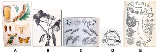 Types of life cycle figures appearing in biology textbooks over time. (A) Color plate of gypsy moth life cycle, in Biology for Today by Curtis, Caldwell, and Sherman (1934) [16], plate opposite p. 200; (B) metamorphosis of monarch butterfly, in Biology for Beginners by Moon (1921) ([17], p. 210); (C) life history of a frog, in Biology for Today by Curtis, Caldwell, and Sherman (1934) ([16], p. 216); (D) life cycle of the bubonic plague, in A Civic Biology by Hunter (1914) ([18], p. 227); (E) life history of the malarial parasite, in Fundamentals of Biology by Haupt (1940) ([19], p. 327).
